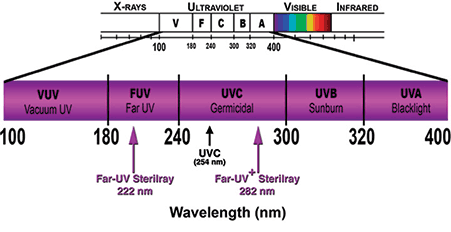 Far-UV Sterilray™ Technology includes a narrow-line, recyclable light source and a compact power source. Multiple independent laboratory tests of Far-UV Sterilray™ devices confirm that they are the first and only dry, chemical-free, recyclable, mercury-free, portable or stationary devices that kill all surface, liquid, and air-borne bacteria, viruses, and spores in seconds. A greater than 99.99% reduction of even the most antibiotic-resistant pathogens (VRE, CRE, C. Difficile, and MRSA) is achieved.